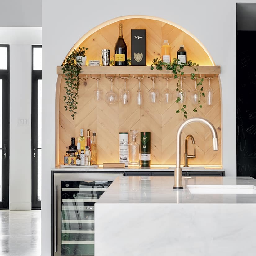Un meuble intégré aux armoires est idéal pour créer un espace bar dans la cuisine. Placez-le à côté du coin repas ou à proximité de la salle à manger, et le tour sera joué! On choisit un mélange de bouteilles rétro et modernes pour un look chic sans effort. Surtout, on ne néglige pas l’éclairage.
