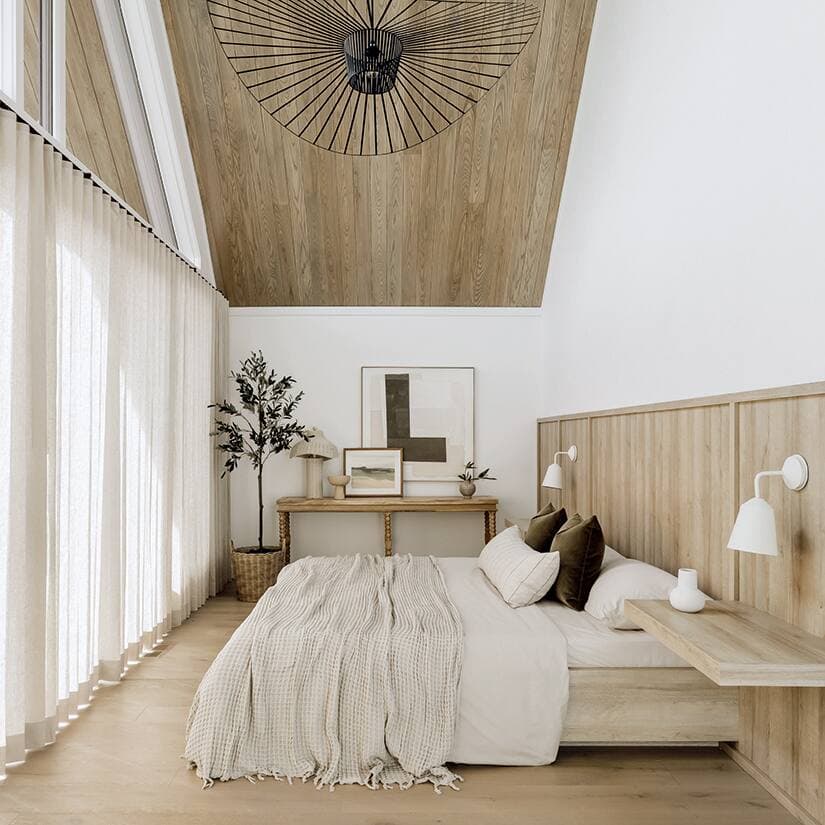 Le plafond lambrissé instaure une ambiance rustique raffinée dans cette chambre scandinave. Cette omniprésence du bois est adoucie par l’utilisation de textiles naturels, tels que la laine tricotée et le coton doux, qui invitent au toucher. Un véritable cocon, idéal pour se ressourcer.