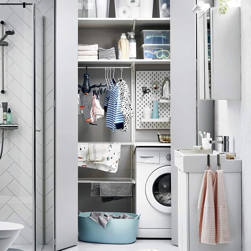 Lessive, adoucissant, détachant, balles de séchage, pinces à linge, fer à repasser, etc. peuvent être stockés dans des armoires fermées pour que l’espace reste zen. Il existe sur le marché différentes options de rangement destiné au coin lavage. On peut notamment allier placards ouverts et fermés à un séchoir, pliable ou non. Les tiroirs intégrés sous la laveuse et la sécheuse sont intéressants si l’on n’a pas besoin de plier le linge sur les machines et qu’aucune restriction physique ne nous empêche de saisir les produits au sol.
