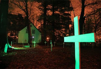 Pour l'Halloween, le Village québécois d'antan se métamorphose, avec une foule de décorations, des éclairages spéciaux, des lanternes et des personnages surprenants qui nous attendent au tournant... Et cette année, grâce à l'ajout de plusieurs nouveautés, les amateurs de frissons en auront pour leur argent! Près d'une vingtaine de lieux seront animés avec des thématiques lugubres, il y aura même un cimetière de zombies. Bien que certaines attractions soient nettement destinées aux ados, les petits peuvent trouver leur bonheur dans le labyrinthe en foin, le petit train fantôme, la maison du maquillage et le magasin de bonbons, évidemment! Ensuite, toute la famille peut se régaler des fameux beignes à l'érable, disponibles à la Beignerie.