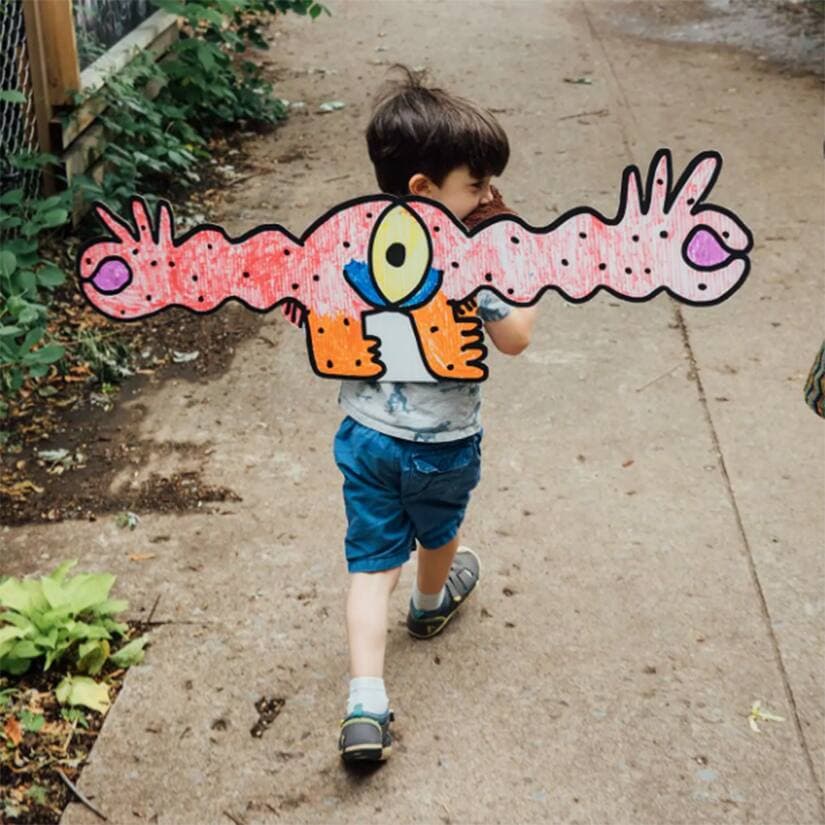 C'est là que l'initiative Les P’tit.e.s Chums entre en scène. Les têtes créatives derrière ce coquet projet ont élaboré un sac à dos en forme d'ailes permettant à l'enfant de s'approprier l'espace qui lui est alloué lorsqu'il s'amuse avec ses pairs.