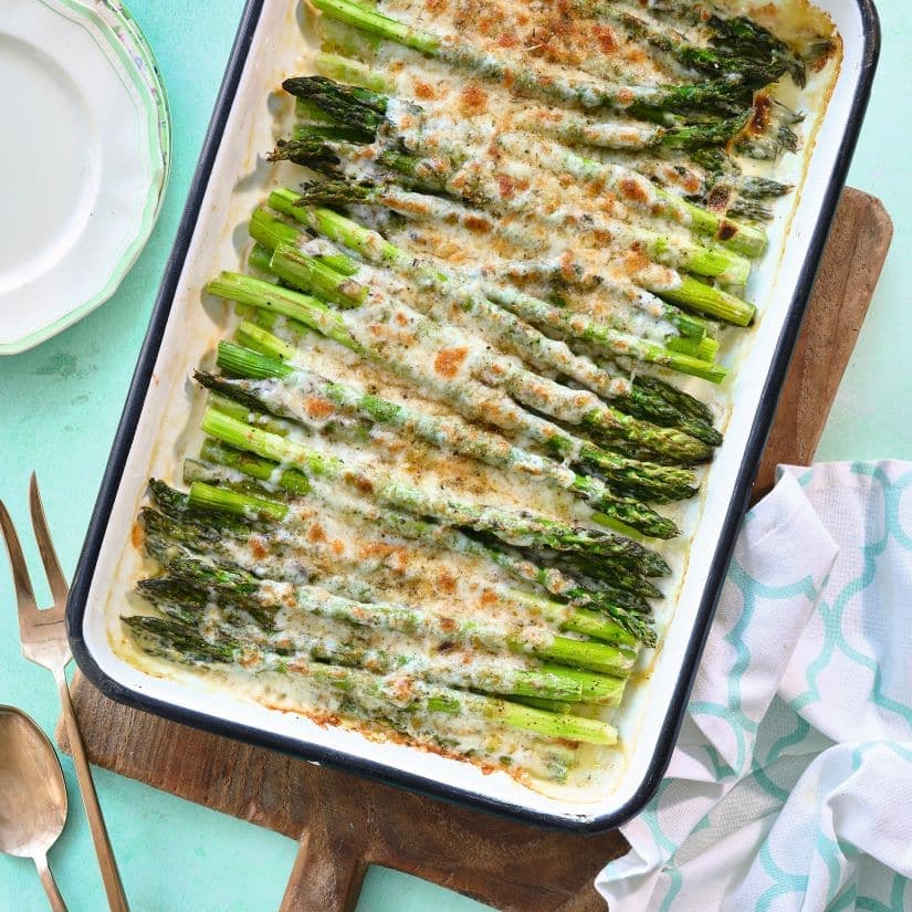 - Préchauffer le four à 425 °F (220 °C). Huiler un plat de cuisson de 9 po x 13 po (23 cm x 33 cm) et y déposer les asperges. Verser la crème, l'huile, l'ail et la muscade sur le dessus, puis saler et poivrer. Cuire sur la grille supérieure du four de 12 à 15 minutes (ou jusqu'à ce que les asperges soient tendres, mais encore croquantes).