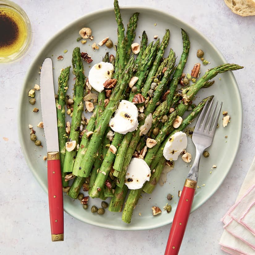 - Répartir les asperges dans des assiettes. Dessus, répartir le chèvre, les noix et les câpres. Verser le vinaigre puis garnir d'un filet d'huile d'olive et de sel croquant. Servir avec des croûtons de baguette, si désiré.