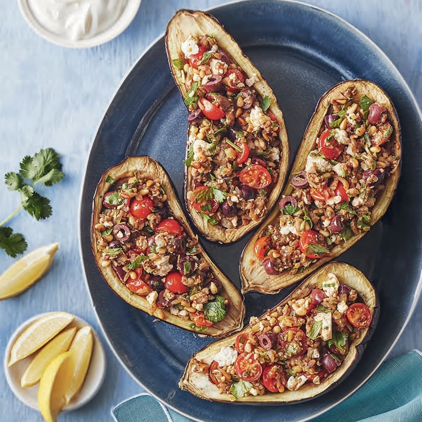 - Farcir les aubergines de la garniture. Arroser d'un filet d'huile d'olive, au goût, et servir accompagné de quartiers de citron ainsi que de yogourt, si désiré.