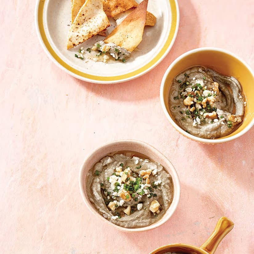 - 2. Au mélangeur ou au robot culinaire, réduire en purée lisse la chair de l'aubergine, le reste de l'huile, le zeste et le jus de citron, les graines de sésame et le tahini. Saler et poivrer. Mettre le baba ganoush dans un bol de service ou le répartir dans des verrines individuelles. Parsemer du féta, des noix et de la ciboulette. Arroser du miel et servir aussitôt.