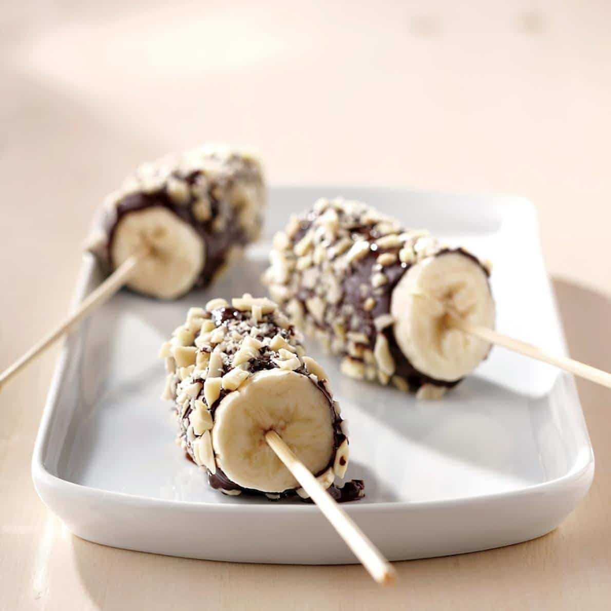 - Couper 2 bananes en trois et insérer un bâtonnet de bois dans chaque morceau. Tremper les morceaux de bananes, un à la fois, dans le chocolat fondu et laisser couler l'excédent.