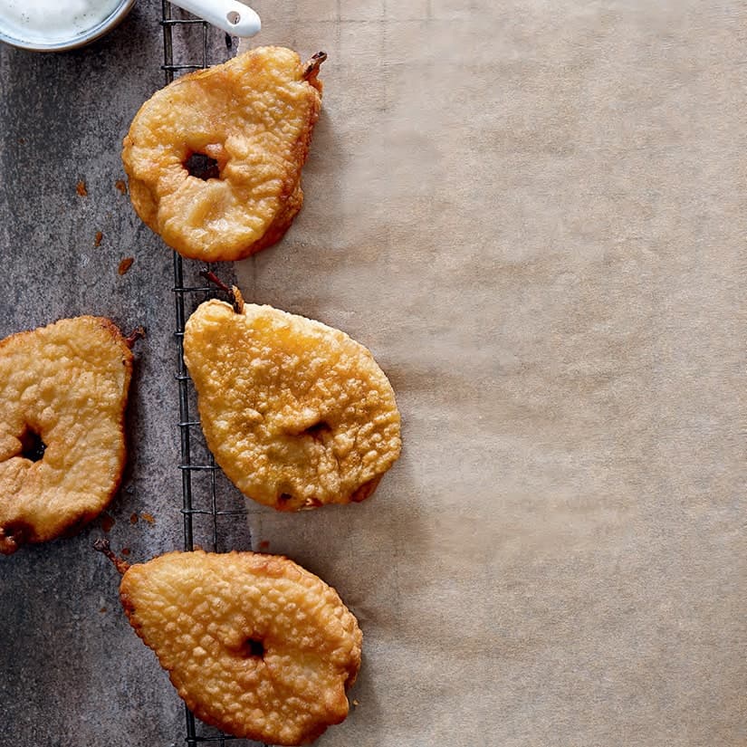 - À l'aide de deux fourchettes, plonger les poires dans la pâte à beignet puis les plonger dans l'huile chaude, quatre à la fois, et cuire 4 minutes ou jusqu'à ce que les beignets soient dorés (les retourner à mi-cuisson).