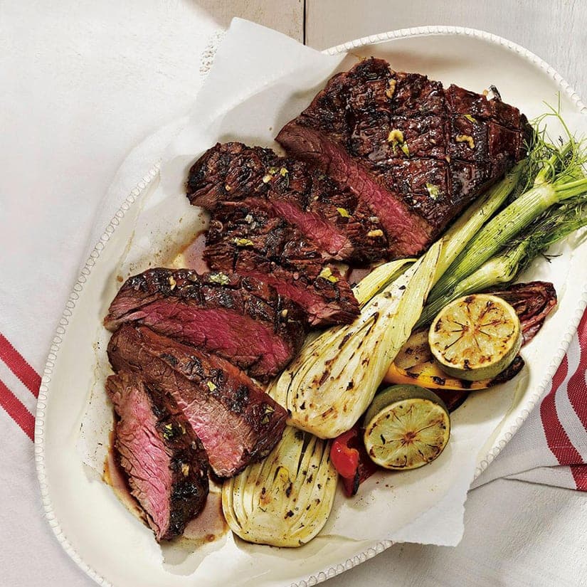 - À l'aide d'un couteau bien aiguisé, couper le bifteck en tranches dans le sens contraire des fibres de la viande. Servir accompagné des limes grillées.