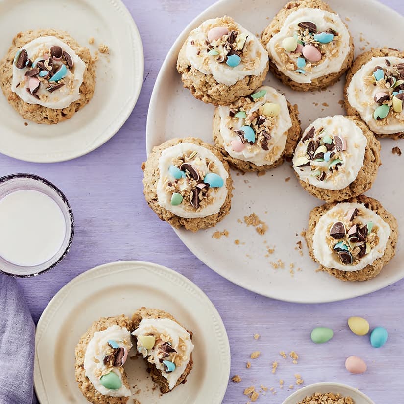 - À l'aide d'une cuillère, glacer les biscuits, puis les parsemer de flocons d'érable et de bonbons de type Mini Eggs écrasés, si désiré. (Les biscuits se conserveront 2 jours dans un contenant hermétique à la température ambiante ou 3 mois au congélateur.)