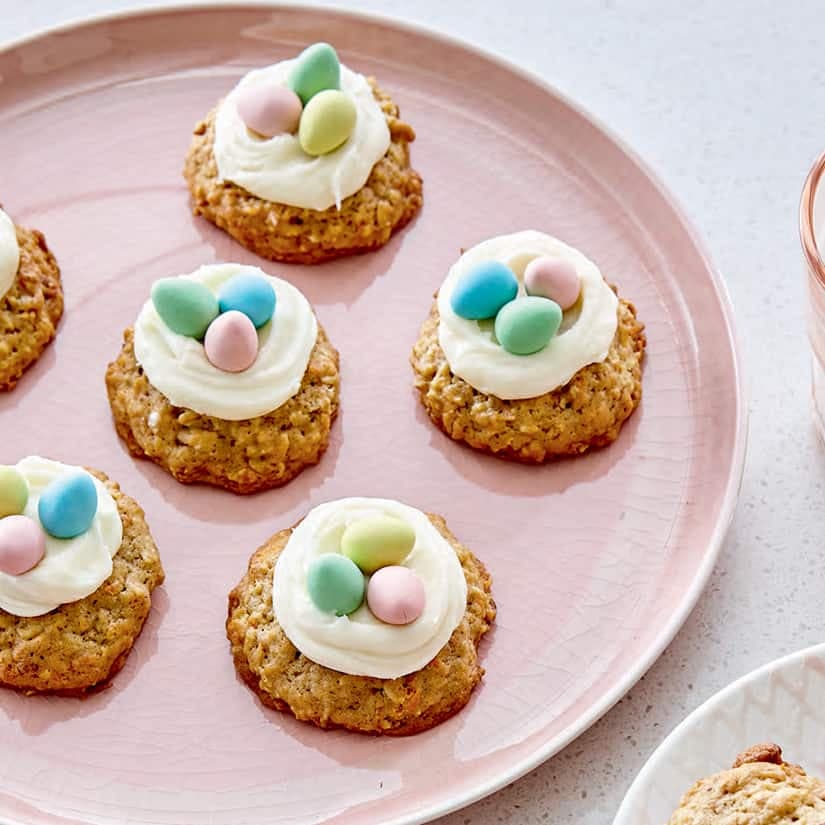 - Au moment de servir, garnir chaque biscuit de glaçage au fromage à la crème et d'œufs de Pâques miniatures.