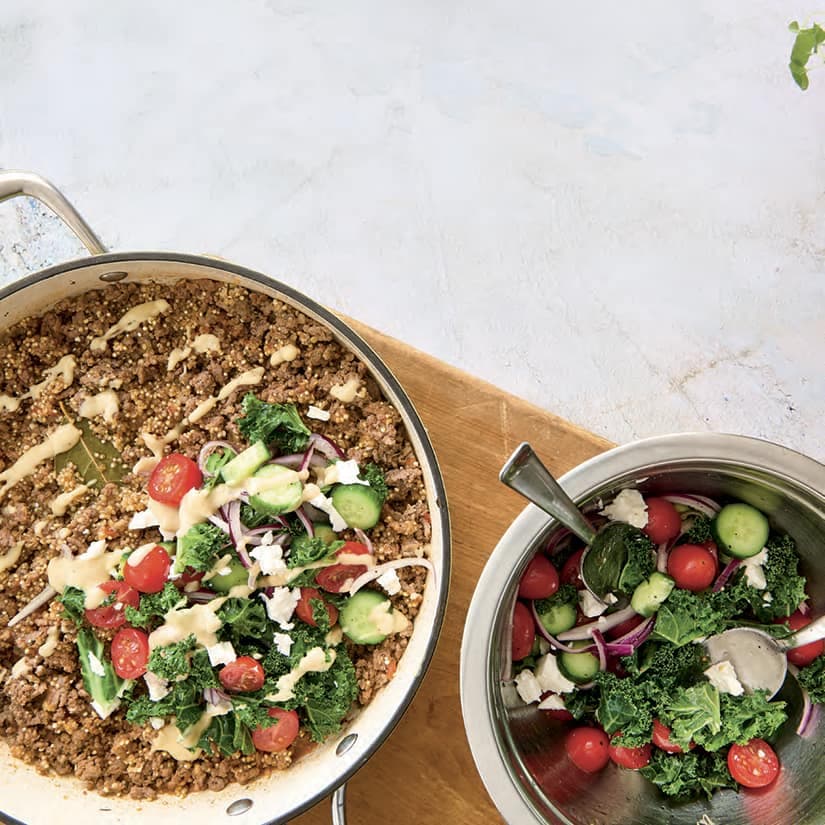 - Dans une casserole, chauffer l'huile à feu moyen-élevé. Faire revenir le bœuf haché, en remuant et en défaisant les morceaux à l'aide d'une cuillère de bois, pendant 3 minutes ou jusqu'à ce que la viande ne soit presque plus rosée. Ajouter le bouillon de poulet, la sauce tomate, le quinoa, la feuille de laurier, l'origan et l'ail. Saler et poivrer puis mélanger. Porter à ébullition, puis couvrir et réduire le feu à minimum. Cuire 12 minutes, puis retirer du feu et laisser reposer, à couvert, 10 minutes de plus (préparer la salade pendant ce temps). Aérer le mélange à l'aide d'une fourchette. Réserver.