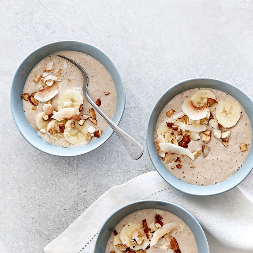 - Au mélangeur, réduire en purée lisse les trois quarts de la banane, la boisson aux amandes, les flocons d'avoine, le beurre d'amande, le sirop d'érable, le jus de citron et la cannelle. Verser le mélange dans un bol et garnir du reste de la banane, des amandes hachées et de la noix de coco.