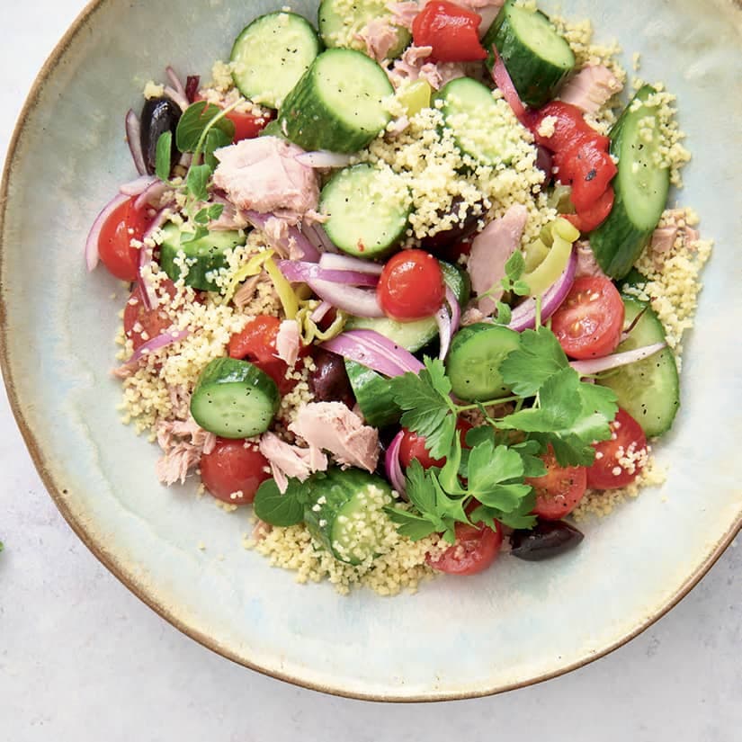 - Dans un petit bol, mélanger l'huile d'olive, le jus de citron, le vinaigre et l'ail. Saler et poivrer. Verser sur les bols de couscous puis garnir de persil plat et d'origan, si désiré.