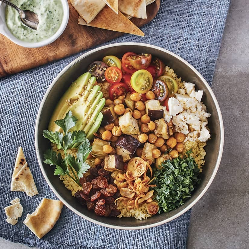 Bols de couscous aux pois chiches et aux aubergines rôtis
