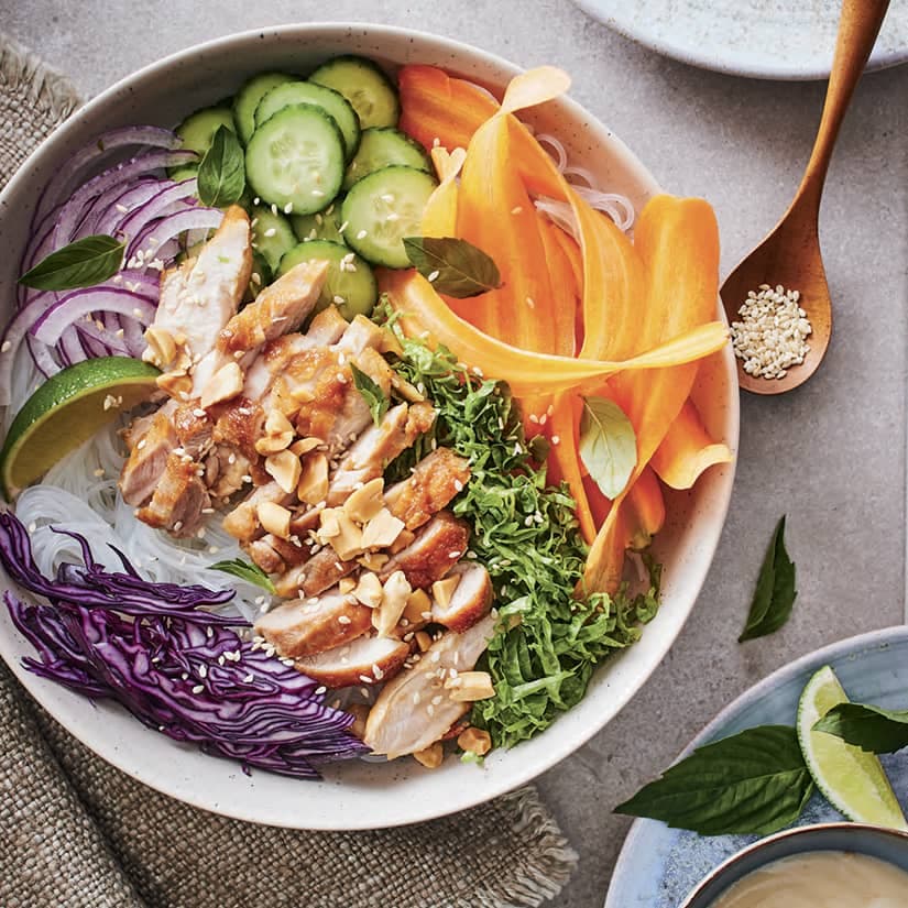 - Répartir les nouilles dans 4 bols. Garnir de poulet, puis ajouter les autres ingrédients et garnitures. Servir avec la sauce au yogourt.