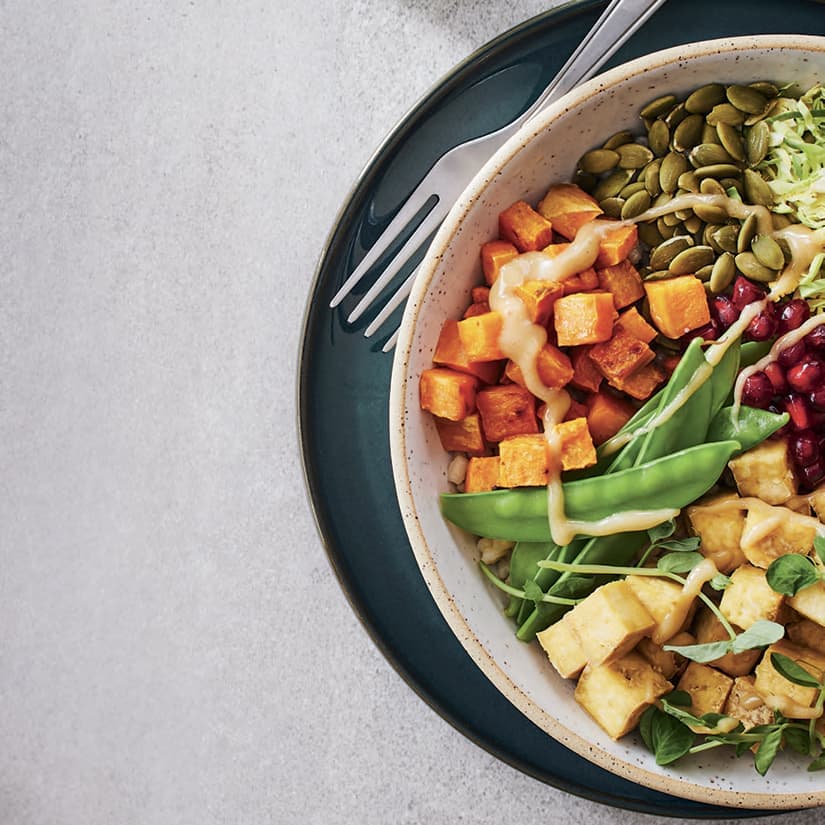 - Répartir l'orge dans 4 bols, ajouter le tofu et la patate douce, ainsi que les autres ingrédients et garnitures. Servir avec la sauce tahini et érable.