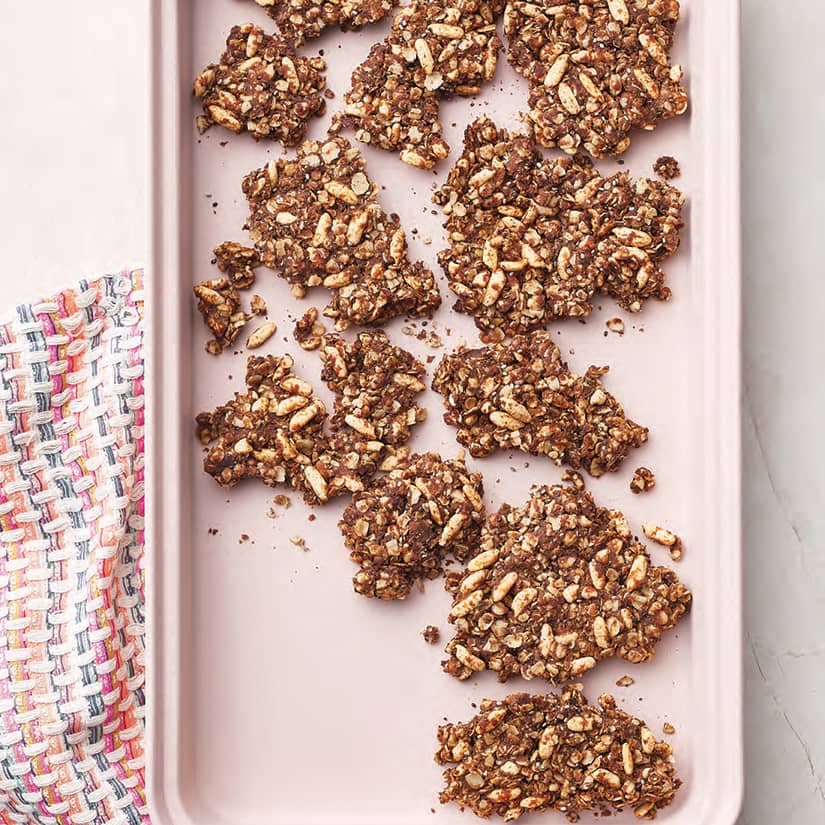 - Étendre la préparation sur une plaque de cuisson tapissée de papier parchemin, en la pressant fermement. Cuire au four préchauffé à 350 °F (180 °C) pendant 15 minutes ou jusqu'à ce que la préparation soit dorée. Laisser refroidir complètement avant de casser en morceaux. (Les bouchées se conserveront jusqu'à 5 jours à la température ambiante.)