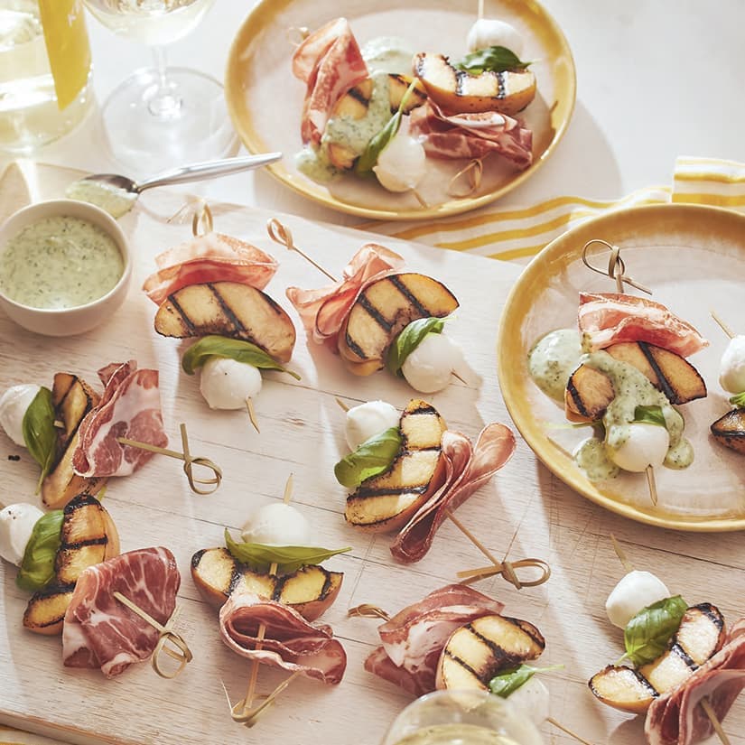- Sur un bâtonnet à brochette cocktail, enfiler un morceau de pêche, une tranche de coppa pliée sur elle-même, un bocconcini et une feuille de basilic. Répéter avec le reste des ingrédients. Servir avec la sauce aux herbes, ainsi que du poivre.