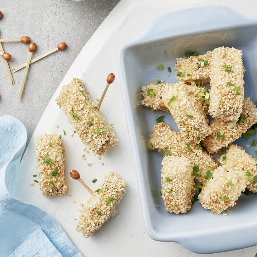 - Vaporiser le panier d'une friteuse à air chaud avec un enduit végétal. Déposer la moitié des bouchées dans le panier de la friteuse, en une seule couche, et les vaporiser d'enduit. Cuire à 350 °F (180 °C) pendant 10 minutes ou jusqu'à ce que le sésame soit doré et que le poisson soit cuit. Cuire le reste des bouchées de la même manière.