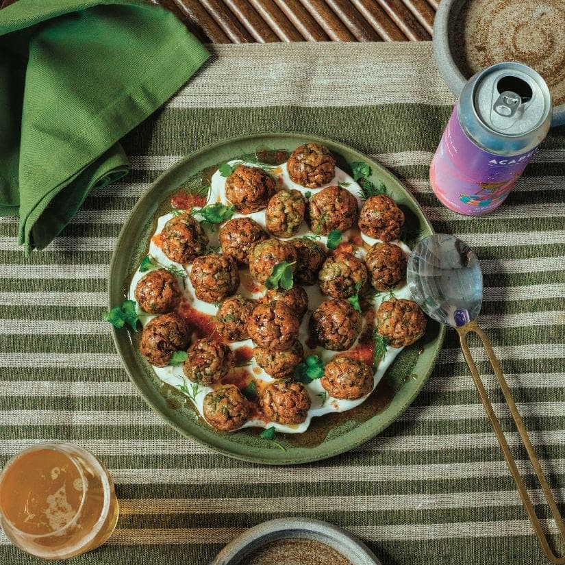 - Répartir le yogourt citronné dans une assiette de service. Déposer les boulettes sur le yogourt, assaisonner d'huile épicée et garnir avec les herbes restantes.