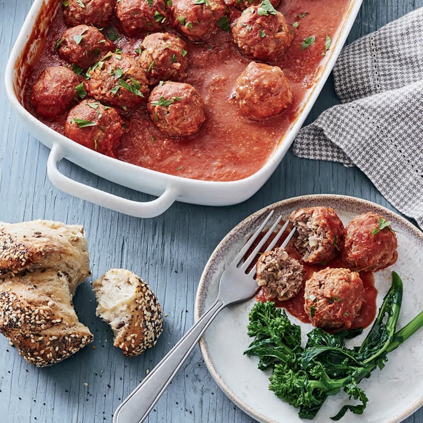 - Préchauffer le four à 350 °F (180 °C) et réserver un plat allant au four de 9 x 13 po (23 x 33 cm). Dans un grand bol, mélanger le bœuf, le riz, l'œuf, l'oignon, l'ail et les herbes. Saler et poivrer. Avec les mains, former environ 20 boulettes de 1,5 po (4 cm) et les déposer dans le plat, en les espaçant un peu.