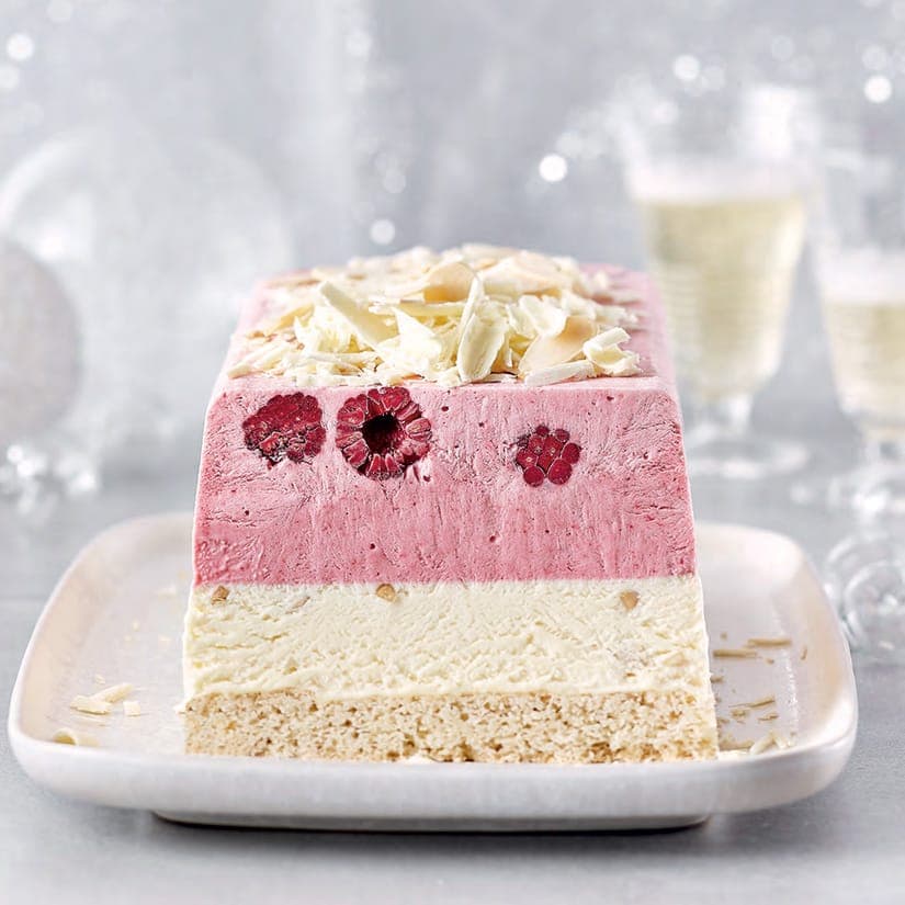 Bûche glacée framboise, chocolat blanc et amande