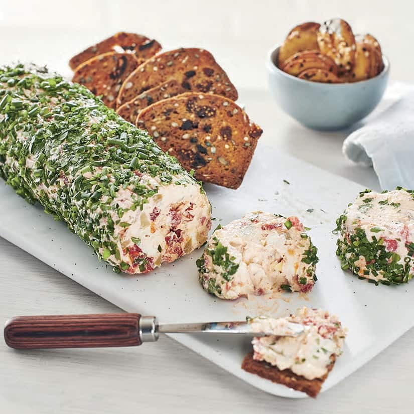 Une bûchette crémeuse aux saveurs d’antipasto : fromage à la crème mélangé à poivrons marinés, tomates séchées, olives, artichauts et fines herbes, roulée dans un manteau de persil et ciboulette. Parfaite avec des craquelins.