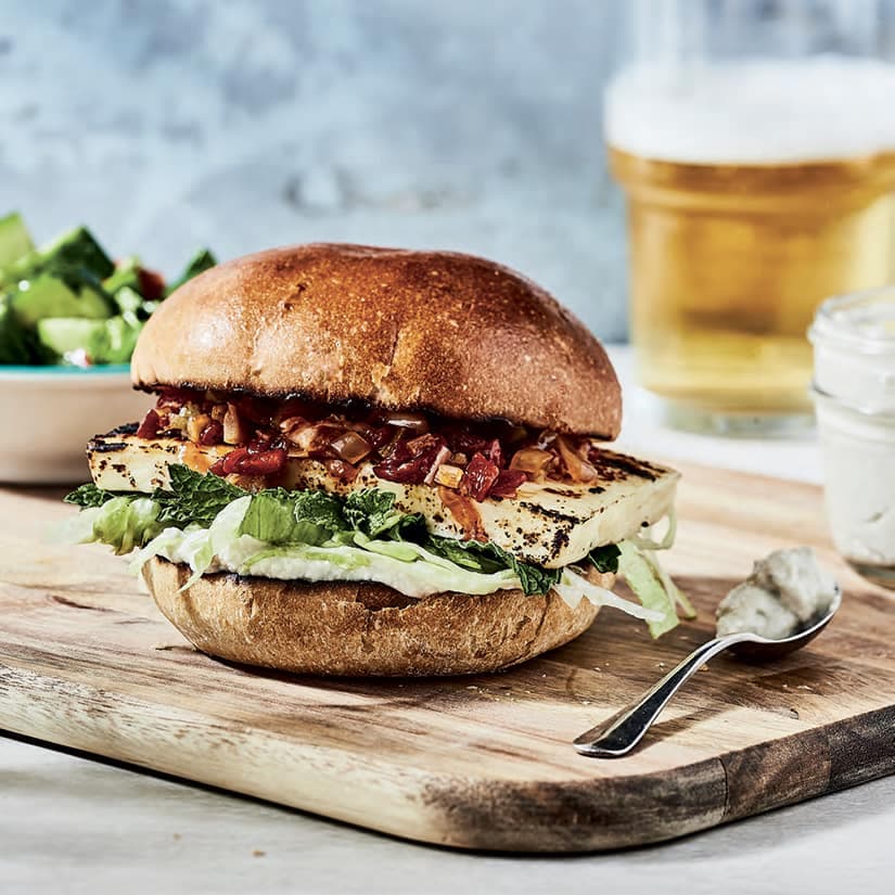 Burger de halloumi, avec relish aux poivrons grillés et aux olives