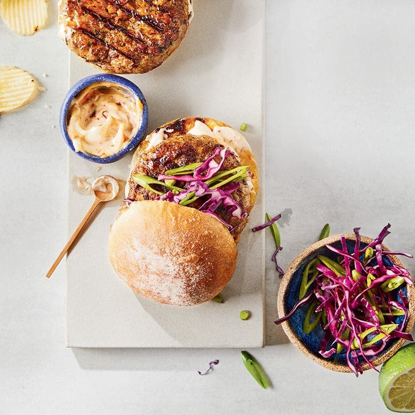 2. Mettre les galettes de dindon dans les pains. Garnir du reste de la mayonnaise au chipotle et du mélange de chou et de mange-tout réservé.