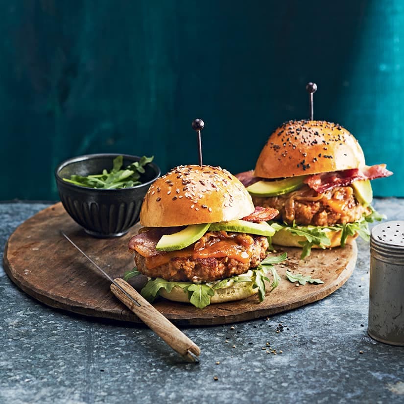 - Garnir les pains du reste de la mayonnaise, de la roquette, des galettes, du reste des oignons caramélisés, de l'avocat et du bacon.