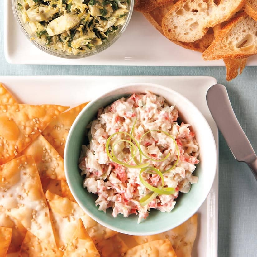 - Dans un bol, à l'aide d'un batteur électrique, battre le fromage à la crème pendant 30 secondes. Ajouter en battant la mayonnaise, l'oignon vert, le gingembre, la sauce soja, le vinaigre de riz, l'huile de sésame et la sauce tabasco. À l'aide d'une cuillère, incorporer la chair de crabe. (Vous pouvez préparer la tartinade à l'avance et la mettre dans un contenant hermétique. Elle se conservera jusqu'au lendemain au réfrigérateur.)