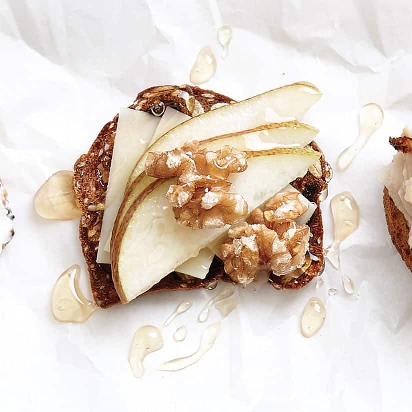 - Sur les craquelins, répartir le gruyère. Garnir de poire et de noix de Grenoble. Arroser d'un filet de miel.