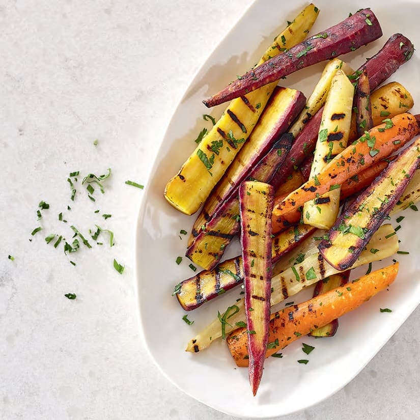 - Mettre les carottes sur la grille huilée du barbecue réglé à puissance moyenne-élevée, fermer le couvercle et cuire de 15 à 20 minutes (les retourner à mi-cuisson).