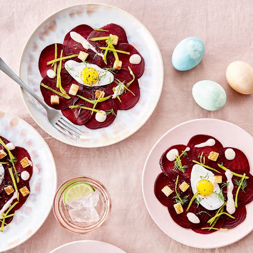 - Au moment de servir, répartir les tranches de betteraves en rosace dans des assiettes. Déposer un œuf miroir au centre de chaque rosace, puis garnir des croûtons réservés et des cornichons. Arroser d'un peu de vinaigrette. Parsemer de feuilles d'aneth et de fleur de sel. Servir avec le reste de la vinaigrette.