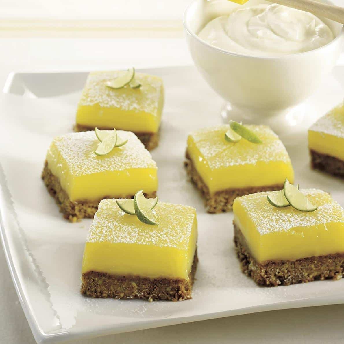 - Au moment de servir, couper en carrés ou en barres. Saupoudrer de sucre glace et garnir de crème de mascarpone et de quartiers de limes, si désiré.