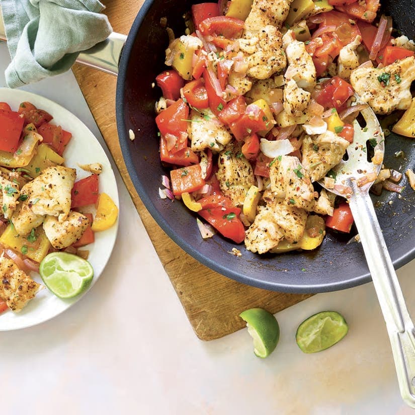 Pendant ce temps, dans une grande poêle, chauffer 1 c. à soupe (15 ml) d’huile à feu moyen. Ajouter l’oignon et l’ail et faire revenir 2 minutes. Ajouter les poivrons et faire revenir 2 minutes. Ajouter la tomate, 1 c. à soupe (15 ml) d’assaisonnement à la cajun et l’origan. Faire revenir 2 minutes. Ajouter les morceaux de poisson cuits ainsi que le jus et le zeste de lime. Cuire 1 minute en mélangeant délicatement. Servir sur du riz et avec des quartiers de lime, si désiré.