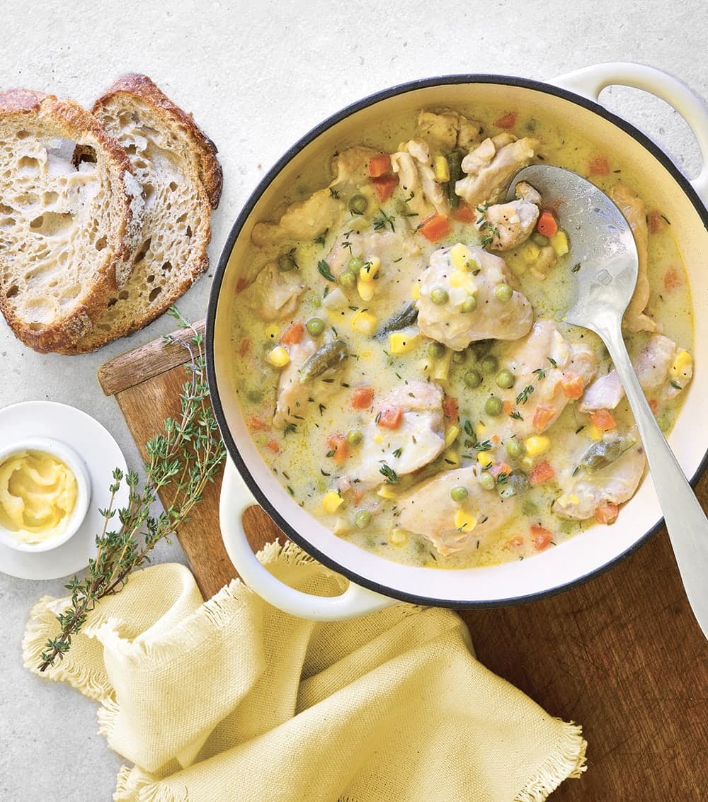 Dans la même poêle, chauffer 1 c. à soupe (15 ml) d’huile avec le beurre. Ajouter l’oignon et l’ail, puis faire revenir 2 minutes. Ajouter les légumes surgelés ainsi que le thym. Faire revenir 3 minutes. Ajouter la farine et cuire 1 minute. Ajouter le bouillon de poulet, le lait et la base de bouillon. Mélanger. Remettre le poulet dans la poêle, baisser le feu et laisser mijoter 10 minutes. Saler et poivrer. Servir garni de thym, avec du pain pour tremper dans la sauce, si désiré.