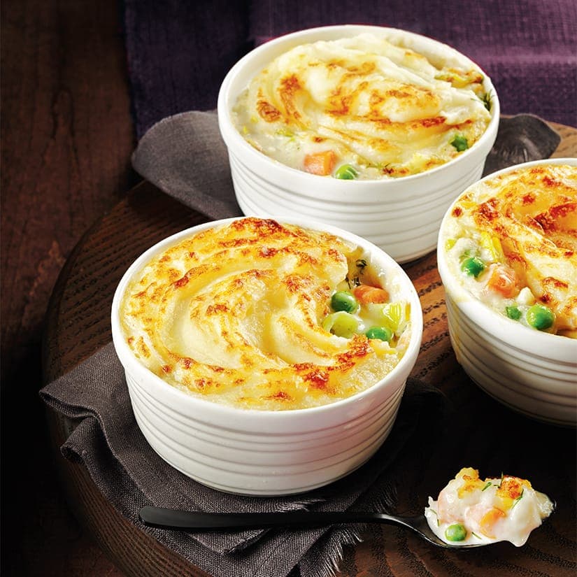 - Répartir la garniture au poisson dans 4 ramequins d'une capacité de 1 t (250 ml) chacun, couvrir de la purée de pommes de terre et lisser le dessus. Déposer les ramequins sur une plaque de cuisson et cuire au four préchauffé à 425 °F (220 °C) pendant 10 minutes ou jusqu'à ce que la garniture soit bouillonnante.