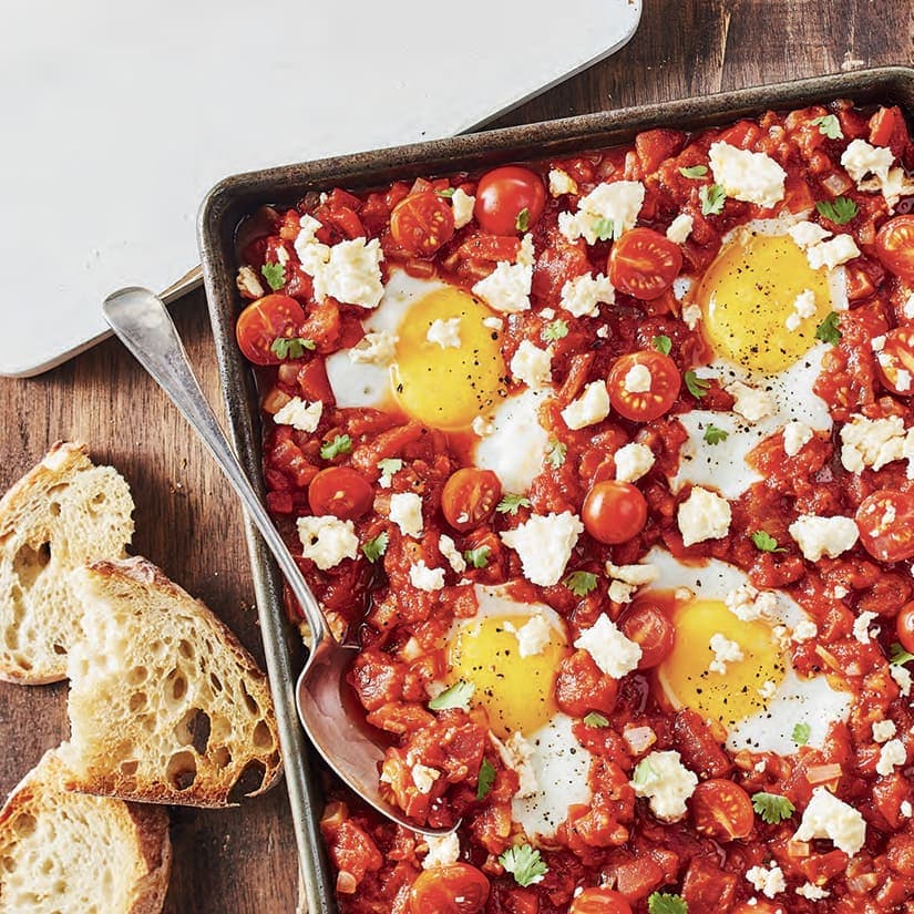 - Étendre le mélange sur une plaque de cuisson et casser les œufs par-dessus, un à la fois. Saler et poivrer. Répartir les tomates cerises et le fromage féta. Cuire au centre du four de 12 à 14 minutes ou jusqu'à ce que les blancs d'œufs soient complètement cuits. Servir parsemé de coriandre fraîche et accompagné de pain crouté.