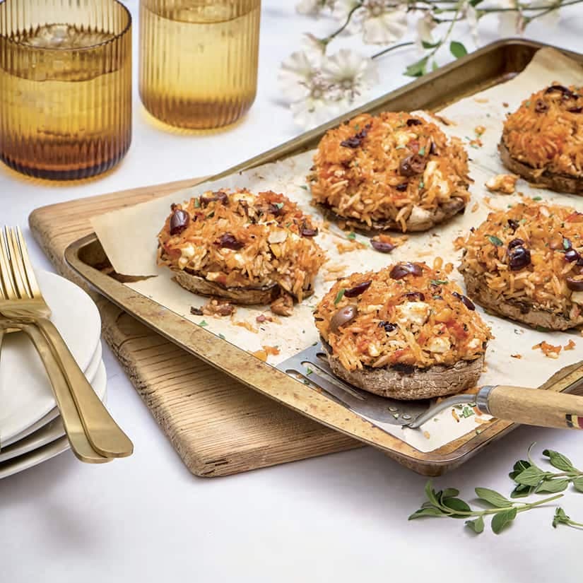 - Dans une grande poêle, chauffer l'huile à feu moyen. Faire revenir l'oignon et l'ail 2 minutes. Ajouter la sauce tomate, les olives, les noix de pin, le riz cuit, le féta et l'origan frais. Assaisonner de sel et de poivre, puis bien mélanger. Réserver.