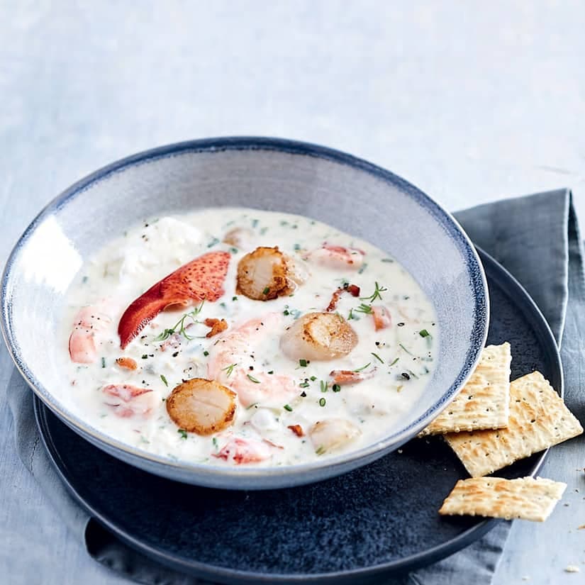 - Au moment de servir, répartir la chaudrée dans des bols. Garnir chaque portion de pétoncles et d'une pince de homard, si désiré. Parsemer du reste du bacon réservé, d'aneth et de ciboulette.