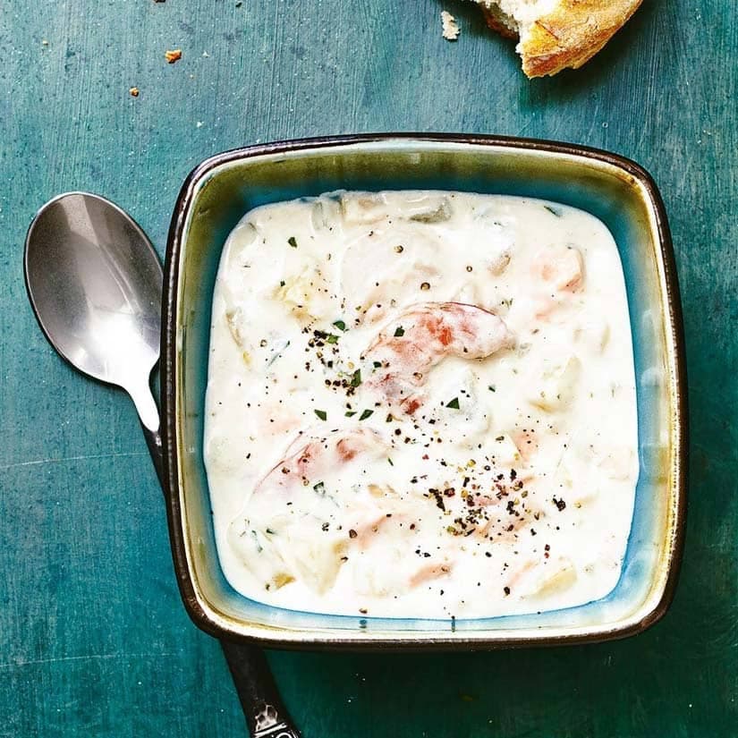 - Dans une mijoteuse, mettre le fenouil, les pommes de terre, l'oignon, le céleri, les feuilles de laurier, le thym, le sel, le poivre et le piment de Cayenne. Ajouter le jus de palourde et l'eau, et mélanger. Couvrir et cuire à faible intensité pendant 8 heures.
