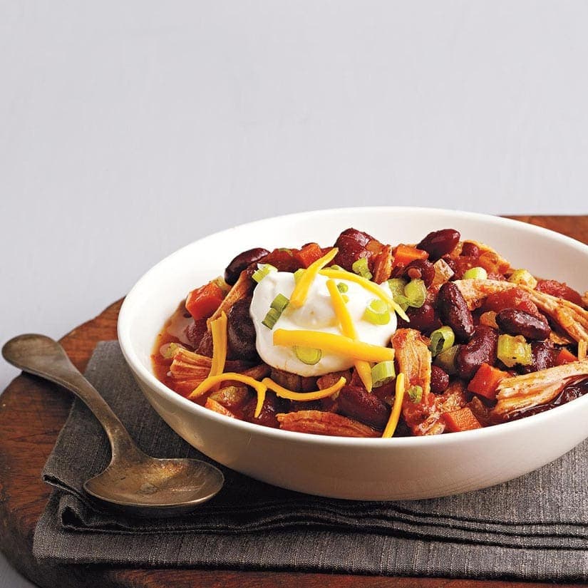 2. Au moment de servir, répartir le chili dans 4 bols. Garnir chaque portion de cheddar, de crème sure et d'oignons verts.