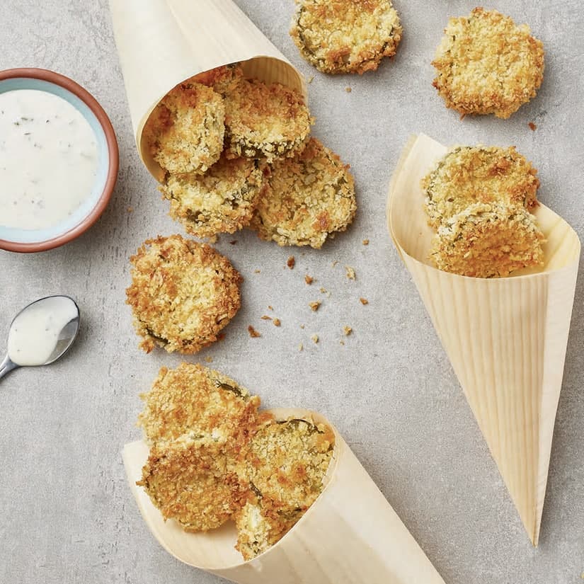 - Vaporiser le panier d'une friteuse à air chaud avec un enduit végétal. Déposer la moitié des cornichons dans le panier de la friteuse, en une seule couche, et les vaporiser d'enduit. Cuire à 375 °F (190 °C) de 12 à 15 minutes ou jusqu'à ce que les cornichons soient dorés (les retourner à mi-cuisson). Cuire le reste des rondelles de cornichons de la même manière. Servir chaud avec la trempette ranch.