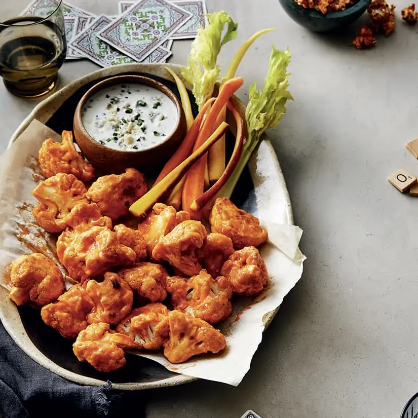 - Dans un grand bol, à l'aide d'un fouet, mélanger la sauce piquante, l'huile et le miel. Ajouter le chou-fleur et mélanger délicatement pour bien l'enrober. Servir les bouchées de chou-fleur avec la trempette crémeuse au bleu, ainsi que des bâtonnets de carottes et de céleri, si désiré.