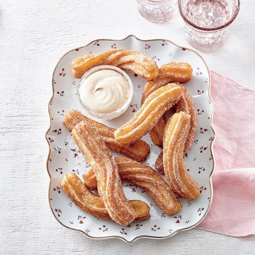 - À l'aide de pinces, retirer les churros de l'huile et les déposer sur une assiette tapissée de papier essuie-tout. Rouler les churros dans le sucre à la cannelle. Servir immédiatement avec la sauce au dulce de leche. (Les churros se conserveront 2 jours au réfrigérateur et jusqu'à 3 mois au congélateur. Réchauffer 10 minutes dans un four préchauffé à 350 °F/180 °C avant de servir.)