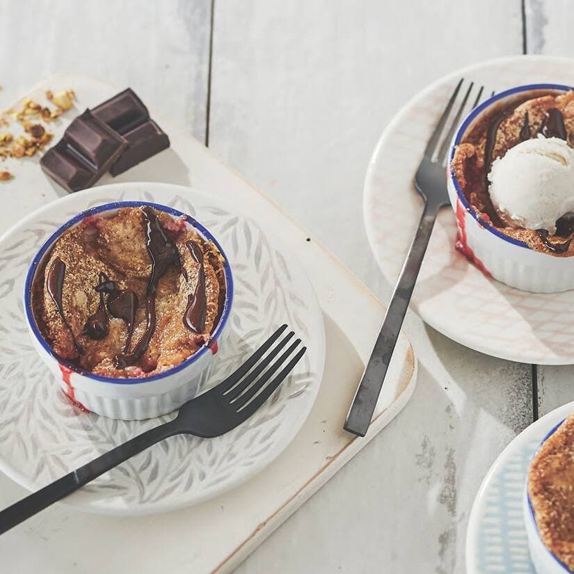 Cobblers aux fraises avec coulis de chocolat noir et pistaches