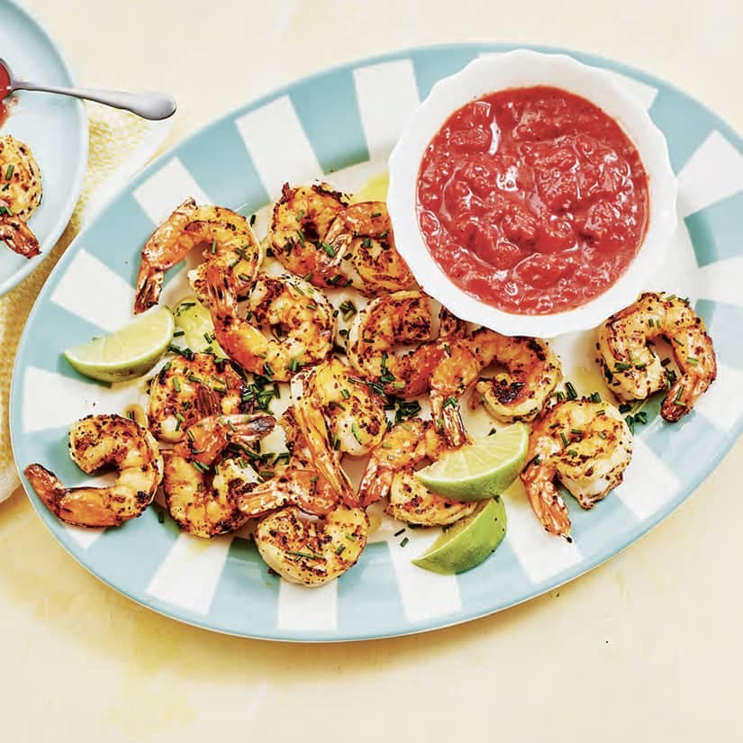 - Éponger les crevettes sur un linge propre et les mélanger avec l'huile et les assaisonnements. Enfiler les crevettes sur des bâtonnets de métal et les déposer directement sur la grille. Griller de 2 à 3 minutes par côté. Servir les crevettes avec la sauce cocktail, arrosées d'un filet d'huile d'olive. Garnir de ciboulette, si désiré.