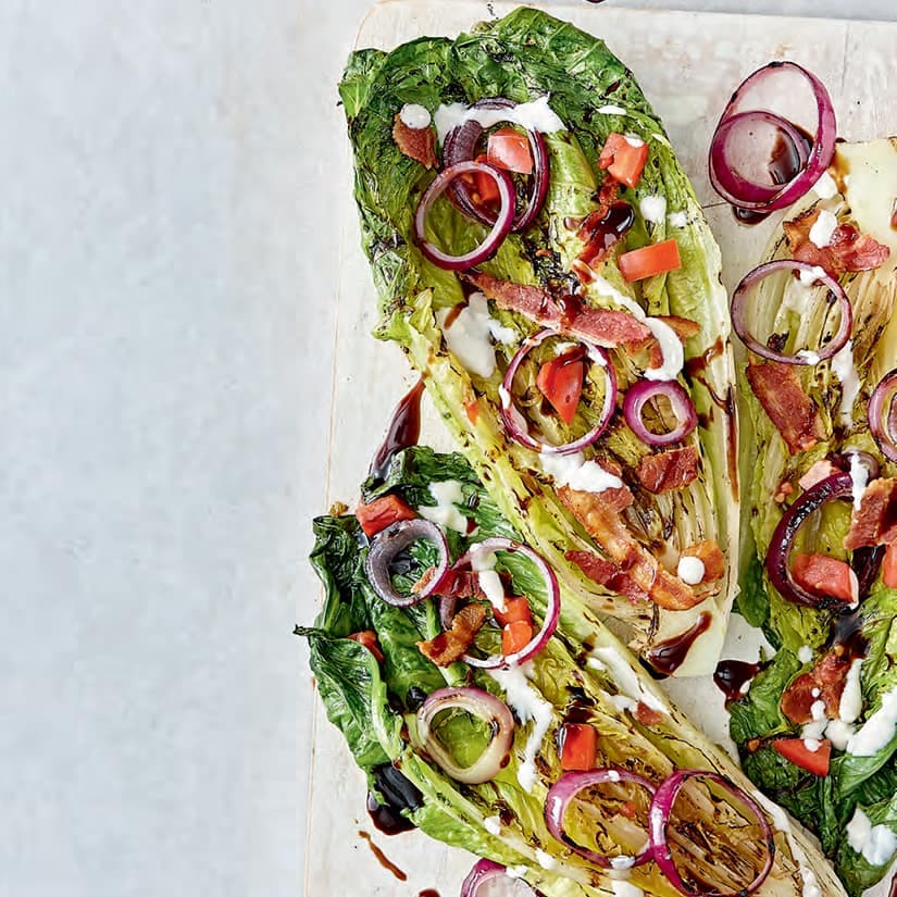 - Régler le barbecue à puissance moyenne. Badigeonner chaque côté des cœurs de romaine et des tranches d'oignon de l'huile. Saler et poivrer. Mettre les légumes sur la grille huilée du barbecue. Sans fermer le couvercle, cuire de 4 à 6 minutes ou jusqu'à ce qu'ils soient légèrement marqués (les retourner à mi-cuisson).