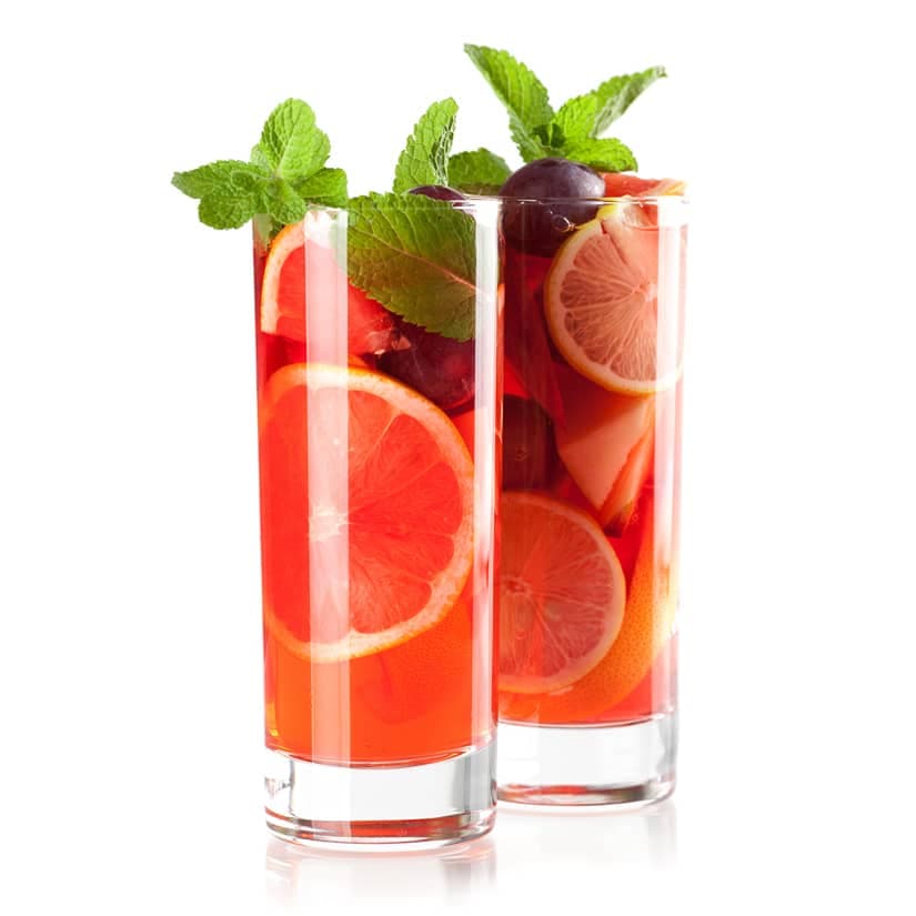 1. Dans un grand verre, mettre les glaçons. Verser l'eau gazéifiée,  le jus d'orange, le jus de pamplemousse et le jus d'ananas. Remuer à l'aide d'une cuillère.